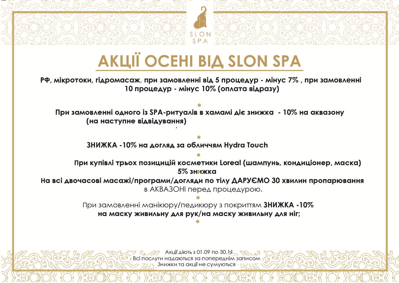 SLON SPA презентує оновленні акції весни: • На масажі для корекції фігури діє ЗНИЖКА - при замовленні від 3 процедур (оплата одразу) - 10%, при замовленні від 5 процедур (оплата одразу) - 15% (антицелюлітний масляний масаж тіла або окремих частин тіла з обгортанням, лімфодренажний моделюючий масаж, слім масаж); • ЗНИЖКА - 10 % на моделювання фігури на апараті3D MAX COOL SHAPING (сгуо-моделювання,ультразвукова кавітація, RF-ліфтинг, ультразвукова терапія) при проходженні 5 процедур гідромасажу;• ЗНИЖКА - 10 % на ліфтинг догляд з моделюючимStretching масажем;• 5% ЗНИЖКИ на лазерну/фотоепіляцію на кожнудругу зону, - 10% ЗНИЖКИ на кожну третю зону(меншу по вартості);• При замовленні манікюру/педікюру з покриттямЗНИЖКА - 10% на фруктовий пілінг з олієюапельсина та манго;• На всі 2-х часові масажі/програми/догляди по тілу даруємо 30 хвилин пропарювання перед процедурою в аквазоні.Порадуйте себе улюбленими процедурами заприємними цінами разом зі SLON SPA